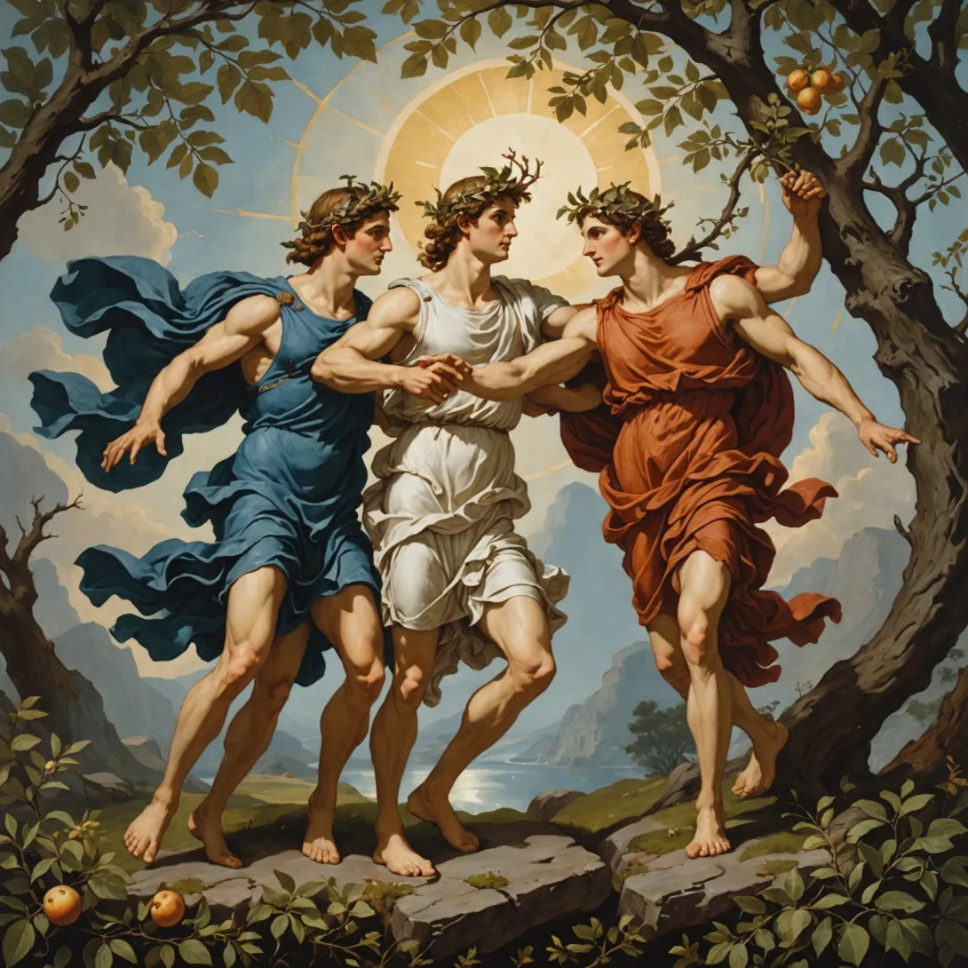 В мифе Аполлон, бог света и искусства, влюбляется в нимфу Дафну, которая стремится сохранить свою свободу и независимость. Когда его чувства становятся навязчивыми, Дафна, чтобы избежать преследования, обращается в лавровое дерево. Этот сюжет иллюстрирует вечный конфликт между желанием и отказом, контролем и автономией.
